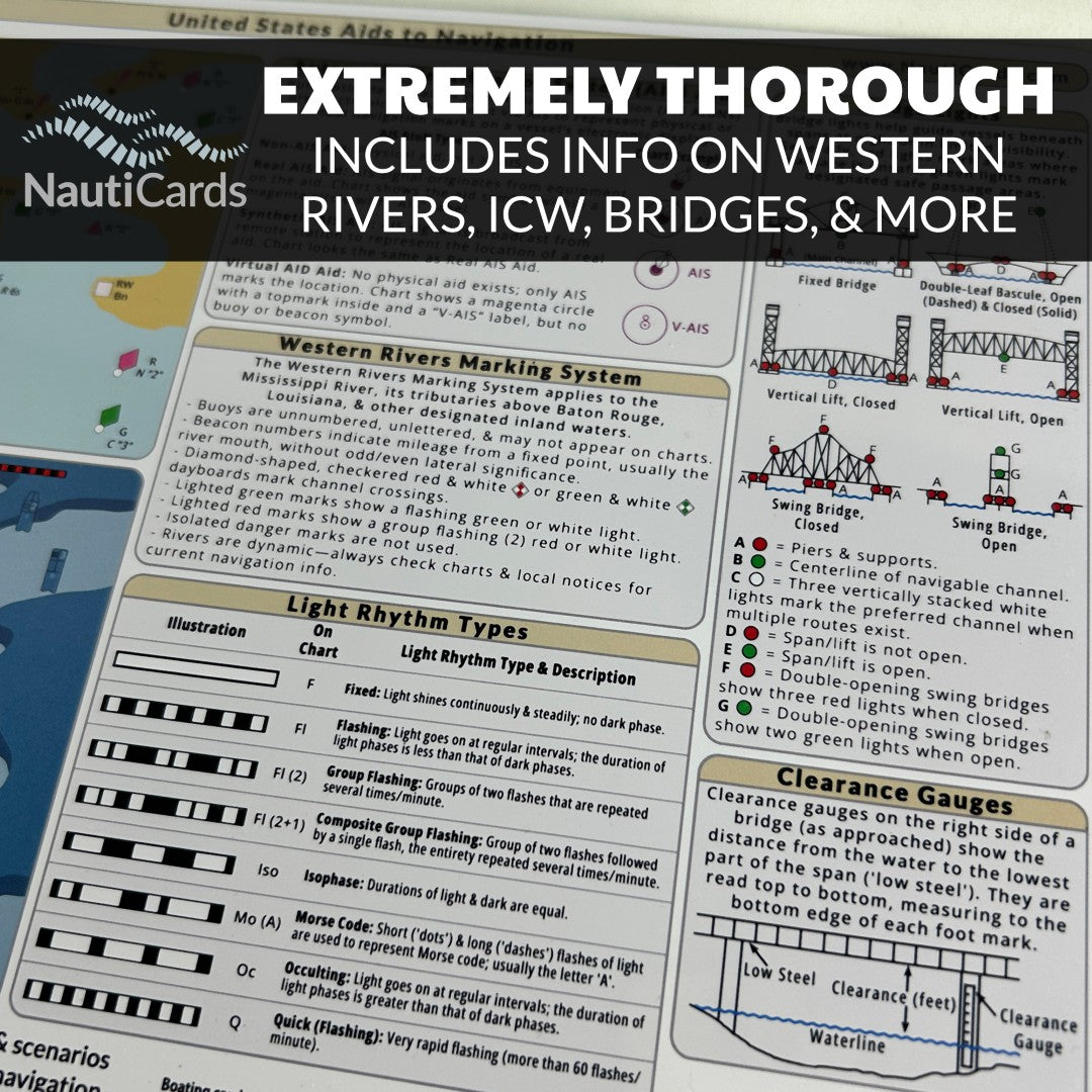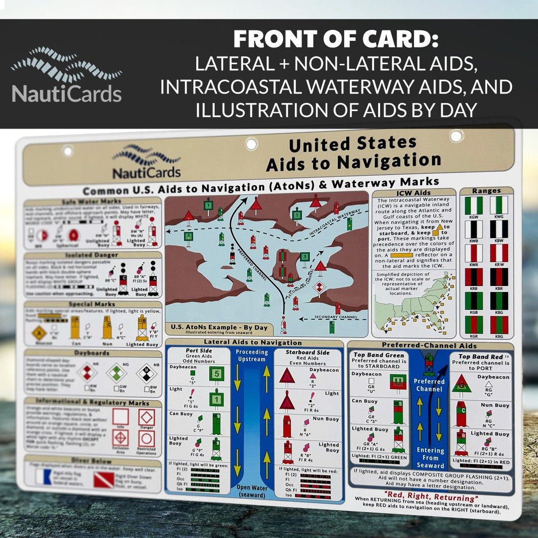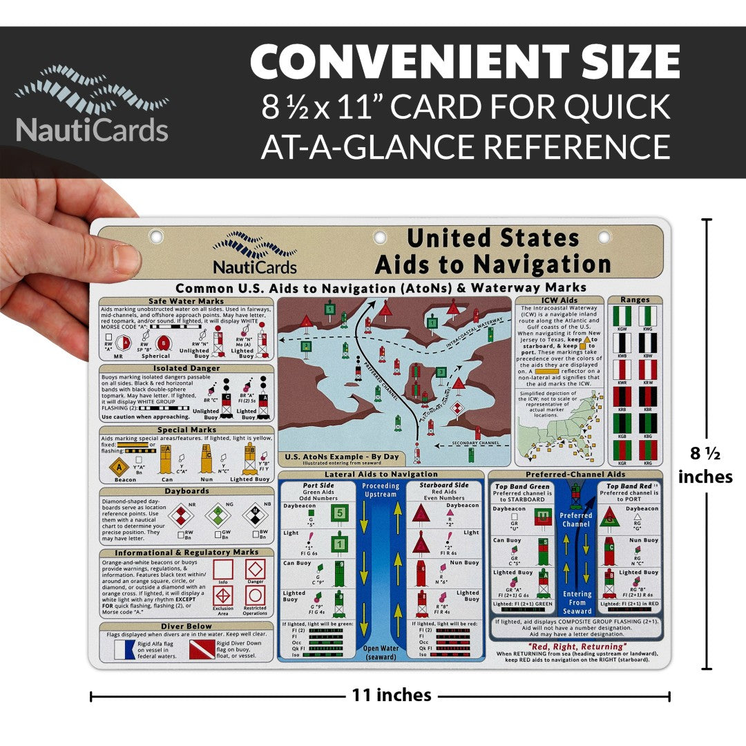 NautiCards United States Aids to Navigation card with dimensions and NautiCards branding.