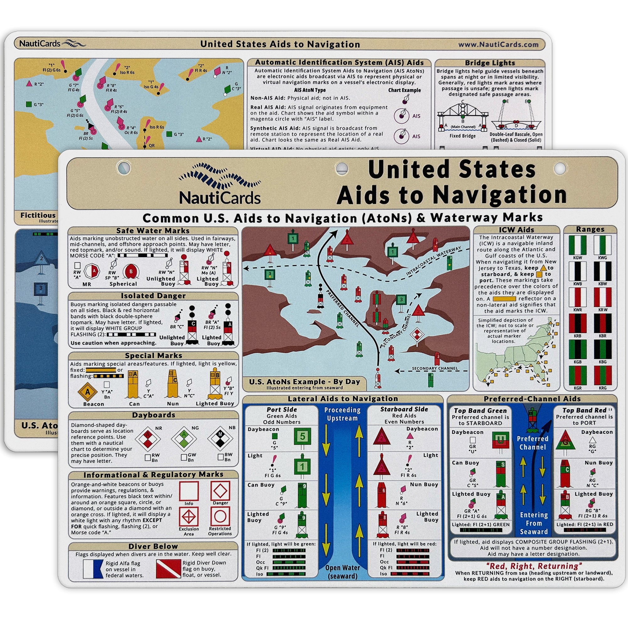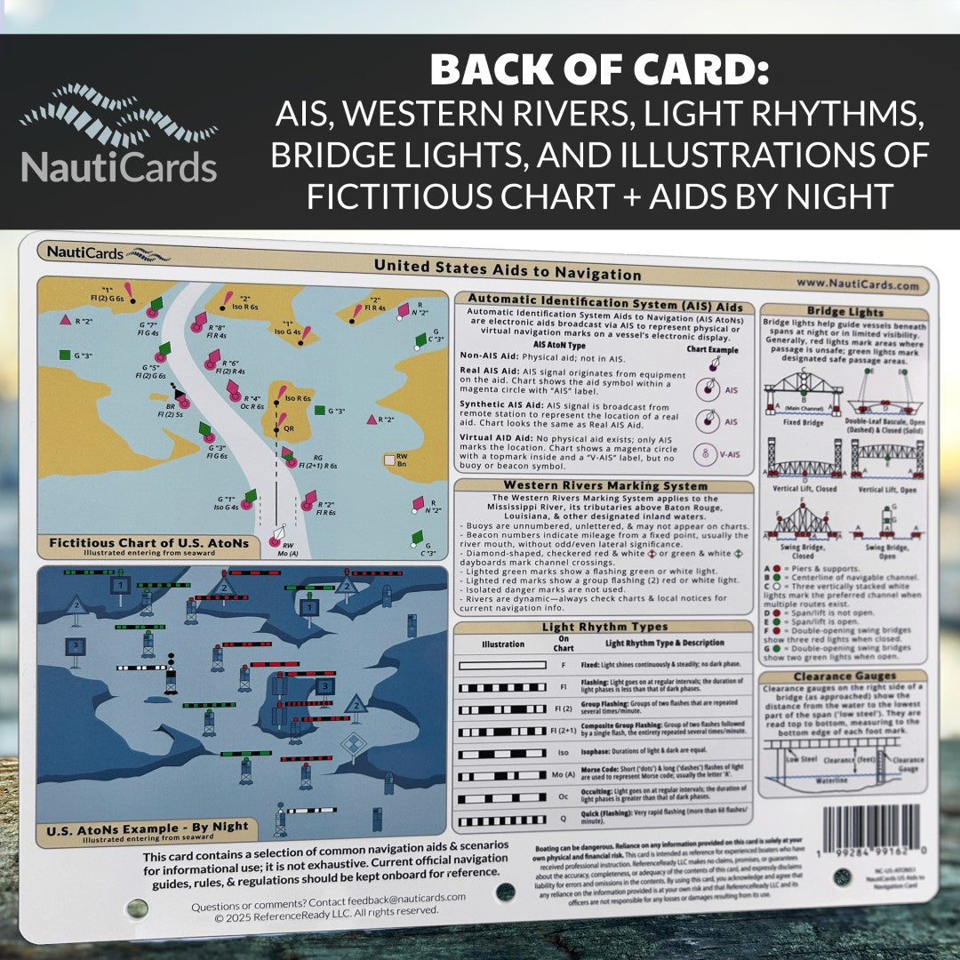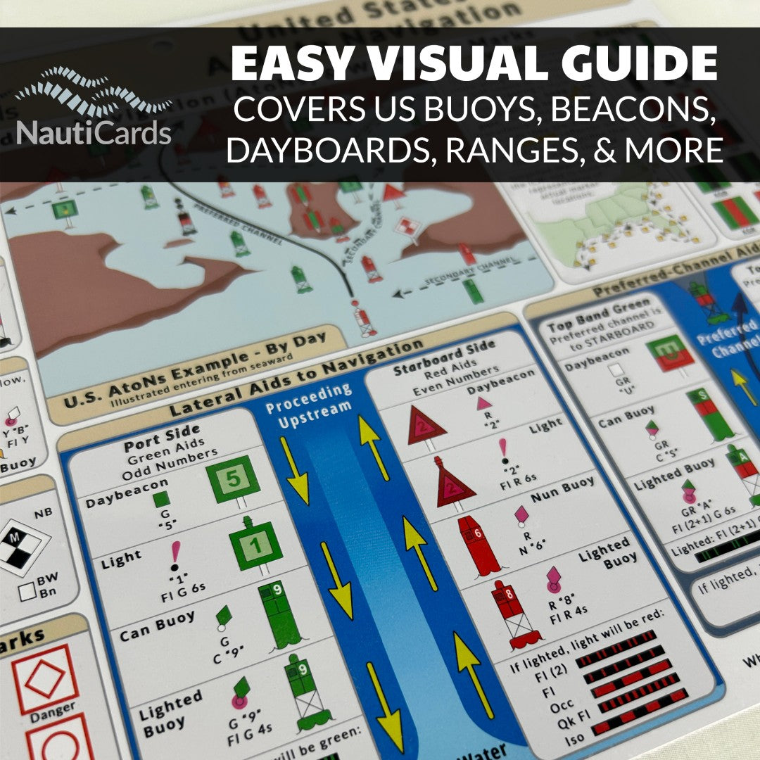 NautiCards United States Aids to Navigation card with dimensions and NautiCards branding.